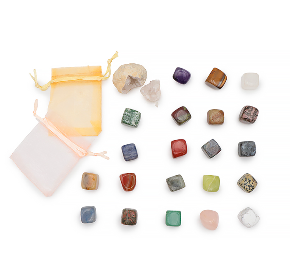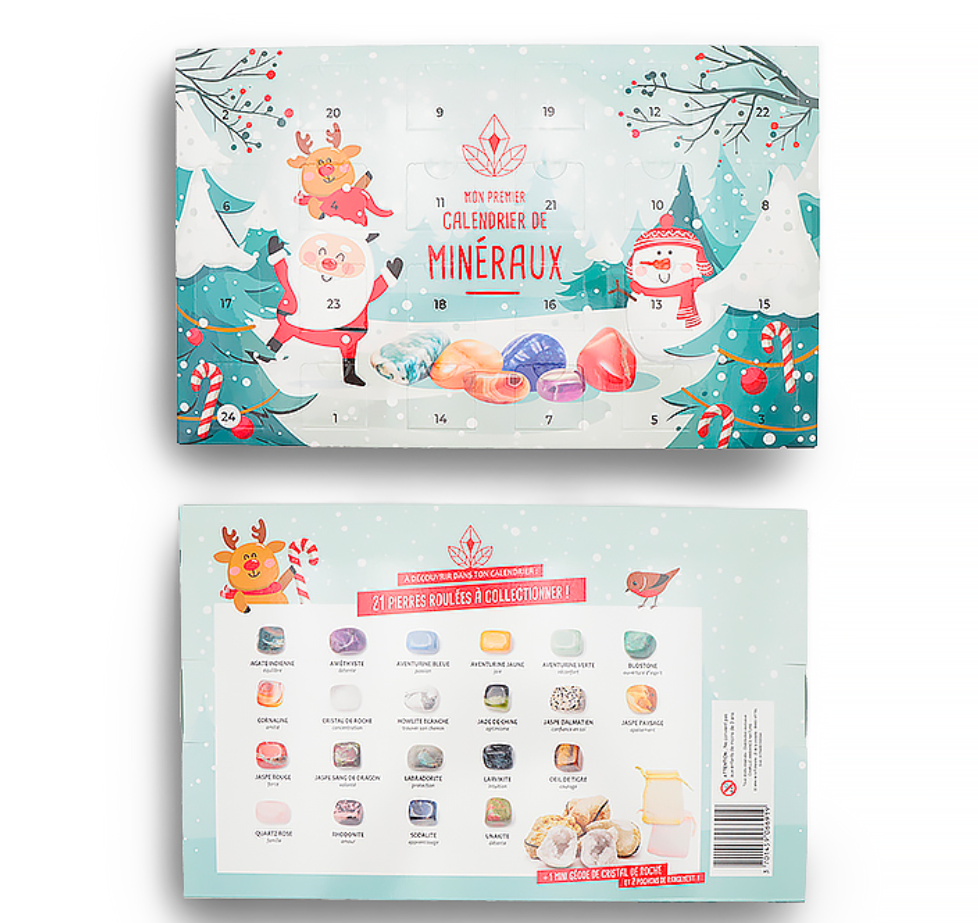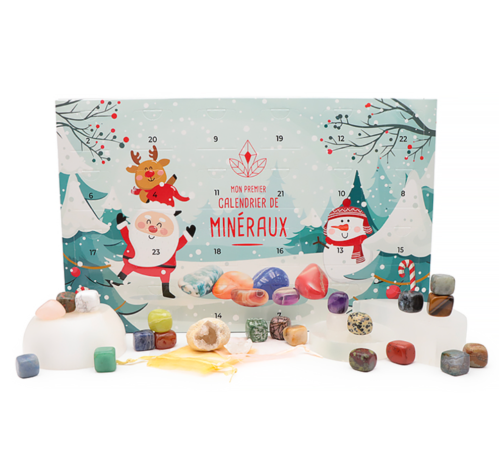 Ce calendrier unique renferme 24 trésors : des pierres roulées comme l’Œil de Tigre, l’Améthyste, le Quartz Rose ou encore la Labradorite, mais aussi une mini géode et de jolies pochettes en organza pour les ranger ou les offrir.